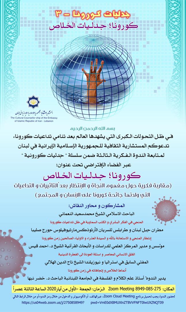 وجاء في الاعلان الذي نشرته المستشارية الثقافية للجمهورية الإسلامية الإيرانية في لبنان أنه "في ظل التحولات الكبرى التي يشهدها العالم بعد تنامي تداعيات كورونا، تدعوكم المستشارية إلى متابعة ندوتها الفكرية الثالثة التي تقام بالتعاون مع وكالة الأنباء القرآنية الدولية(إکنا) ضمن سلسلة «جدليات كورونية عبر الفضاء الافتراضي»، التي تحمل عنوان «كورونا: جدليات الخلاص»(مقاربة فكرية حول مفهوم النجاة والانتظار بعد التأثيرات والتداعيات التي ولدتها جائحة كورونا على الانسان والمجتمع).