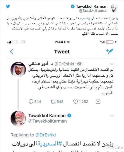 وكتبت الناشطة تغريدة جديدة عبر حسابها الشخصي على التويتر، قالت فيها: "ونحن لا نقصد انفصال السعودية إلى دويلات حسب تنوعها الطائفي والعشائري والجهوي، بل إقليما في المنطقة الشرقية وآخر في الجنوب وثالث في الشمال ورابع وخامس .. يستقل كل منها إداريا مثل الاتحاد الروسي تجمعهما حكومة فدرالية مؤقتا ثم يأتي التصويت على الاستقلال بحسب رأي شعوب تلك الأقاليم".