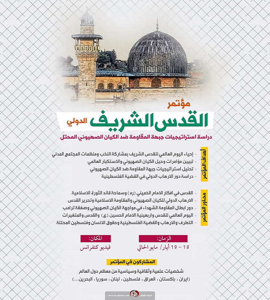 وأضاف أن هذا العام بسبب تفشي فيروس كورونا، هناك قيود على تنظيم مسيرة يوم القدس العالمي، لهذا قررنا تنظيم مؤتمر القدس الشريف الدولي عبر الفضاء الافتراضي، وذلك بهدف دراسة استرتيجيات جبهة المقاومة ضد الكيان الصهيوني المحتل.