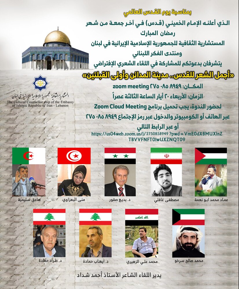 على اعتاب يوم القدس العالمي الذي يصادف الجمعة الاخيرة من شهر رمضان (22 ايار/ مايو)، وجهت المستشارية الثقافية للجمهورية الاسلامية في لبنان وبمشاركة المنتدى الفكري اللبناني دعوة عامة للحضور في ندوة شعرية إفتراضية، بمشاركة شعراء بارزين من محور المقاومة من مختلف البلدان العربية والاسلامية.