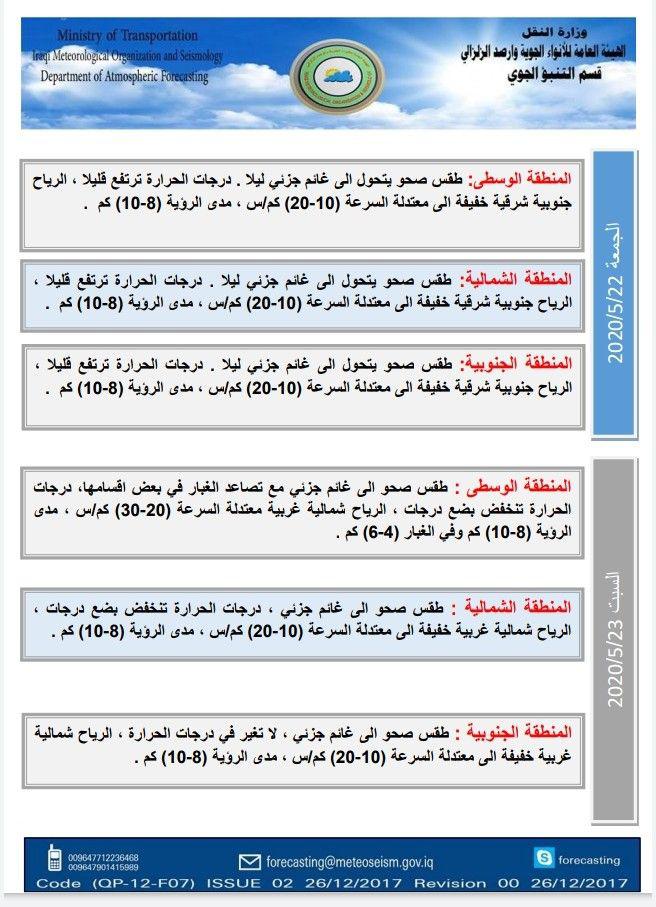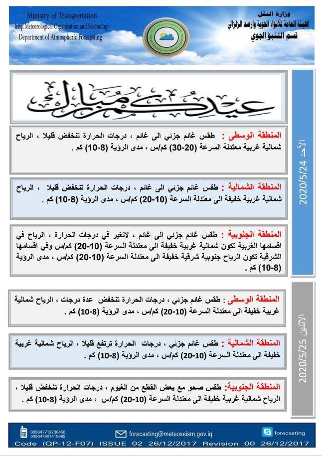 العراق _ الكوثر: نشرت هيئة الانواء الجوية العراقية، الخميس، حالة الطقس للايام المقبلة بما فيها اول ايام عيد الفطر، فيما اشارت الى ان الطقس سيشهد تصاعد غبار وانخفاض قليل بدرجات الحرارة.