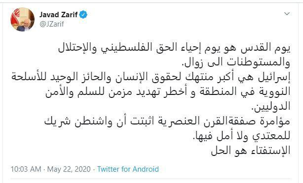 كما وصف وزير الخارجية الايراني "صفقة القرن" انها كانت مؤامرة عنصرية وقد اثبتت هذه المؤامرة ان واشنطن كانت شريكا للمعتدي وانه لاامل فيها.