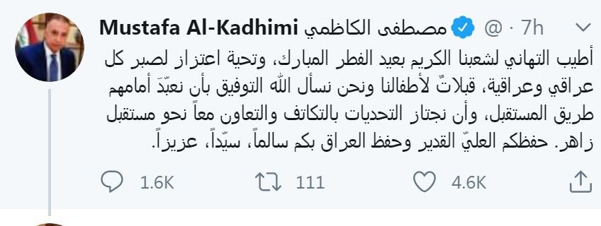 وقال الكاظني في تغريدته: "أطيب التهاني لشعبنا الكريم بعيد الفطر المبارك، وتحية اعتزاز لصبر كل عراقي وعراقية، قبلاتٌ لأطفالنا ونحن نسأل الله التوفيق بأن نعبّدَ أمامهم طريق المستقبل، وأن نجتاز التحديات بالتكاتف والتعاون معاً نحو مستقبل زاهر. حفظكم العليّ القدير وحفظ العراق بكم سالماً، سيّداً، عزيزاً".