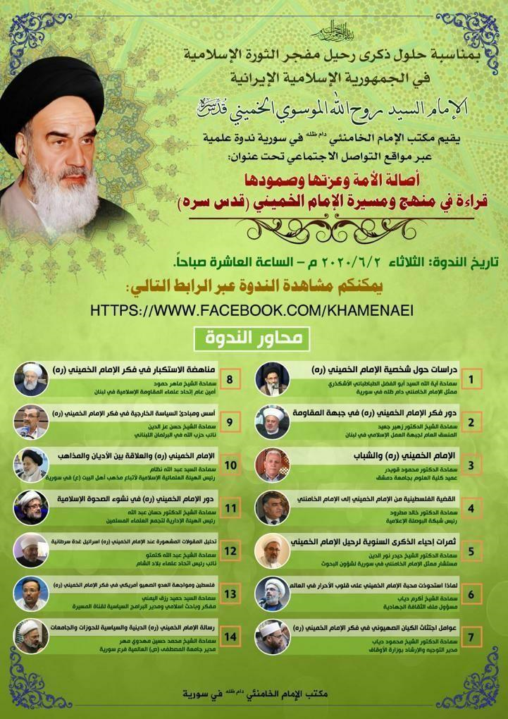 وافاد بيان للعلاقات العامة لمكتب ممثلية قائد الثورة الاسلامية في سوريا، بمناسبة حلول الذكرى السنوية لرحيل مفجر الثورة الاسلامية الامام الخميني (قدس سره) ، سيقيم مكتب الامام الخامنئي في سوريا ندوة علمية تحت عنوان "اصالة الأمة وعزتها وصمودها ، قراءة في منهج ومسيرة الامام الخميني (قدس سره)، صباح يوم غد الثلاثاء عبر مواقع التواصل الاجتماعي بسبب تفشي فيروس كورونا وتطبيق التعليمات الصحية.