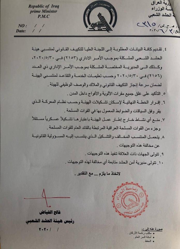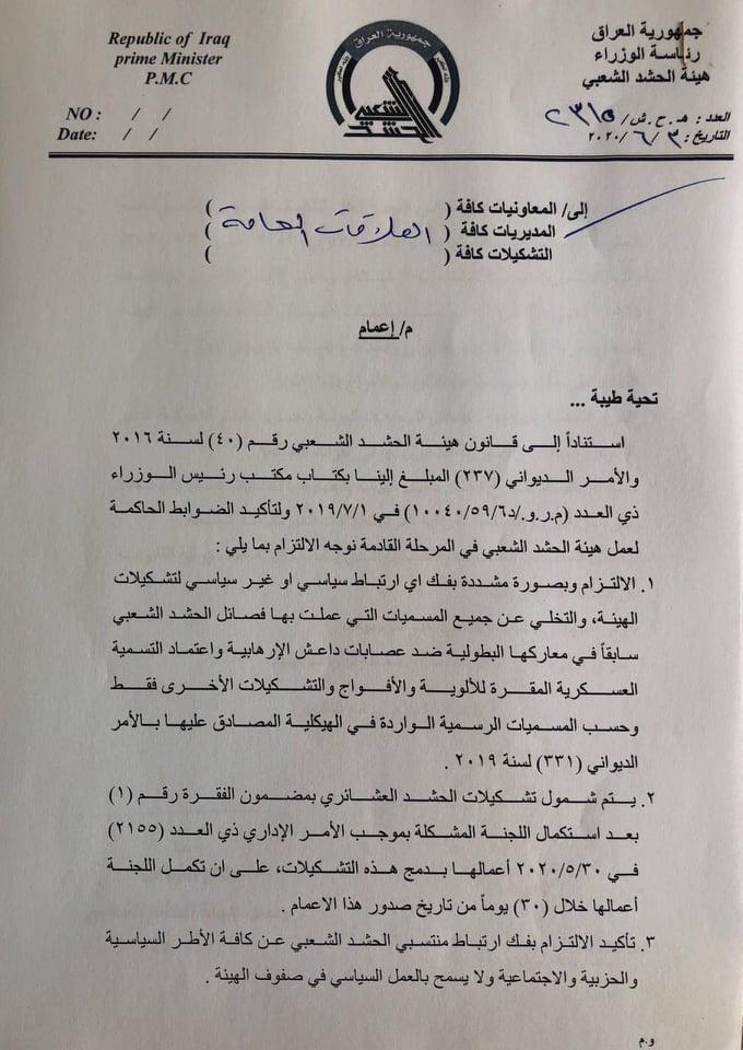 بالوثائق..رئيس هيئة الحشد الشعبي يصدر 10 قرارات