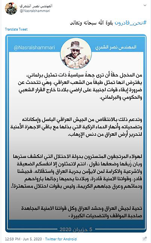 وفي ادناه صورة لتغريدة الشمري: