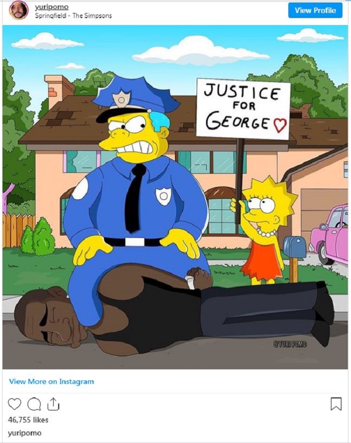 الصورة الأولى التي تناقلتها المواقع الفنية باعتبارها نبوءة العمل بمقتل فلويد، ظهرت فيها ليزا سيمبسون بينما تحمل لوحة كتب عليها "العدالة لجورج"، فيما تقف بجوار شرطي يركع على عنق رجل أسود، ما يشبه الطريقة التي لقي بها فلويد حتفه.