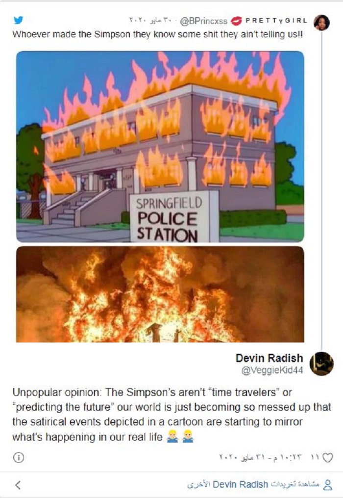 لكن سرعان ما بدأ جمهور منصات التواصل تداول بعض الصور على اعتبارها مشاهد متفرقة من المسلسل الشهير "عائلة سيمبسون" تثبت أن صُنّاعه تنبؤوا بمقتل جورج فلويد بل وما تبعه من احتجاجات وأعمال شغب أيضا، وهو الأمر الذي على غرابته لم يستنكره أحد لما عرف عن المسلسل من تفاصيله الكثيرة والعجيبة التي قدمها صُناعه قبل سنوات وتحققت.