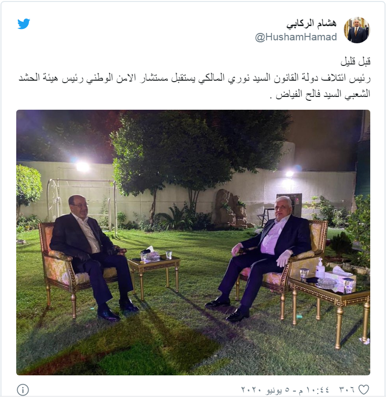 وفي وقت لاحق، نشر الركابي صورة لرئيس ائتلاف دولة القانون خلال استقباله مستشار الامن الوطني رئيس هيئة الحشد الشعبي فالح الفياض.