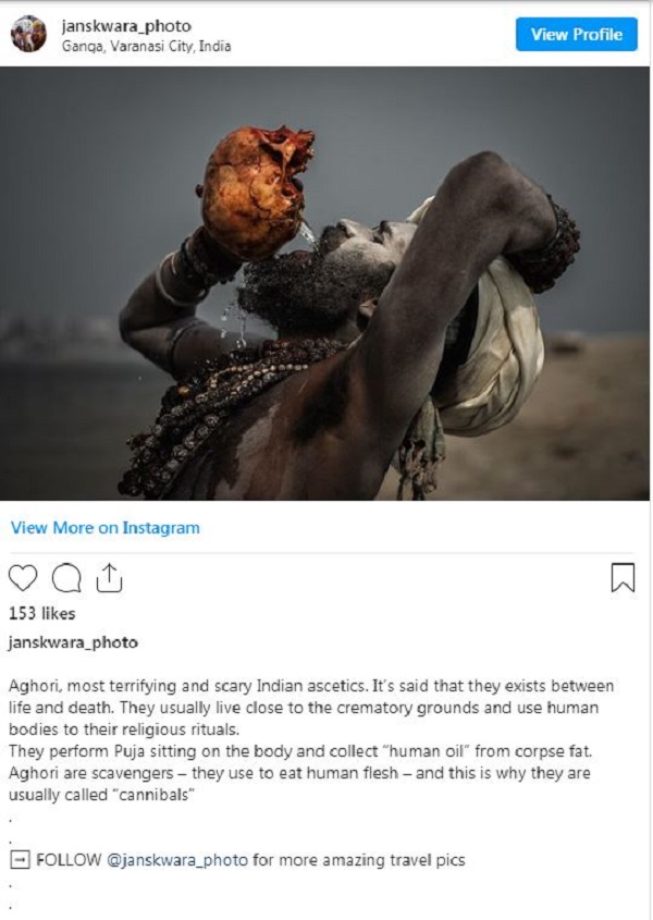 وكان المصور المغامر، جان سكوارا، عمره 38 عاما من بروشكو في بولندا، مسافرا عبر فاراناسي الهندية، عندما اعترضت طريقة مجموعة من قبيلة "أغوري" (Aghori)، ووثق وجودهم المرعب.