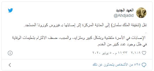 ووفقا لتغريدة نشرها “العهد الجديد”، فإن الإصابات في الأسرة الحاكمة متفشية وبشكل كبير ومتزايد، والسبب ضعف الالتزام بتعليمات الوقاية في ظل وجود عدد كبير من الخدم.