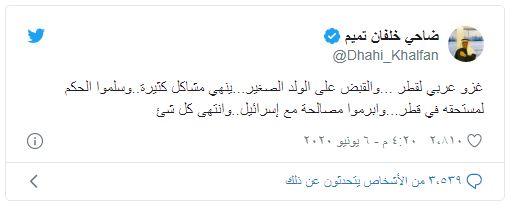 وفي تغريدة له عبر حسابه بموقع "تويتر"، قال "خلفان": غزو عربي لقطر والقبض على الولد الصغير (لم يسمه) ينهي مشاكل كثيرة .. وسلموا الحكم لمستحقه في قطر وأبرموا مصالحة مع (إسرائيل) .. وانتهى كل شيء".