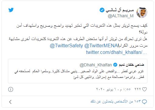 وردت عليه شيخة قطرية تدعى "مريم آل ثاني"، متسائلة: "كيف يسمح تويتر بمثل هذه التغريدات التي تعتبر تهديدا واضحا وصريحا واستهدافا لأمن دولة؟"