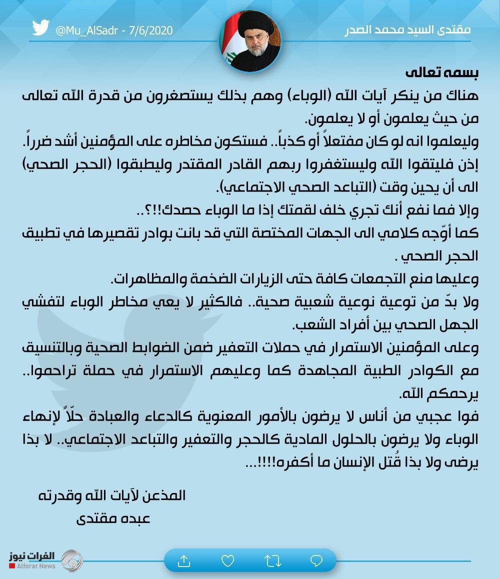 وطالب الصدر في منشور له، امس الأحد بتطبيق الحجر الصحي، داعياً الجهات المختصة إلى "منع التجمعات كافة، حتى الزيارات الضخمة والمظاهرات".