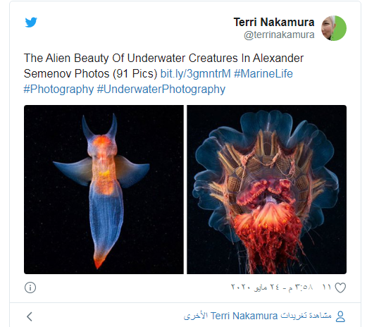 وتشمل الصور الرائعة قنديل البحر اللامع مع جسم أزرق ومخالب وردية تشبه المعكرونة، يبلغ طولها أكثر من 15 مترا، ودودة ذهبية تشبه الأمعاء ولافقاريات صغيرة تشبه الأضواء الجنية المعروفة باسم Euplokamis dunlopae.