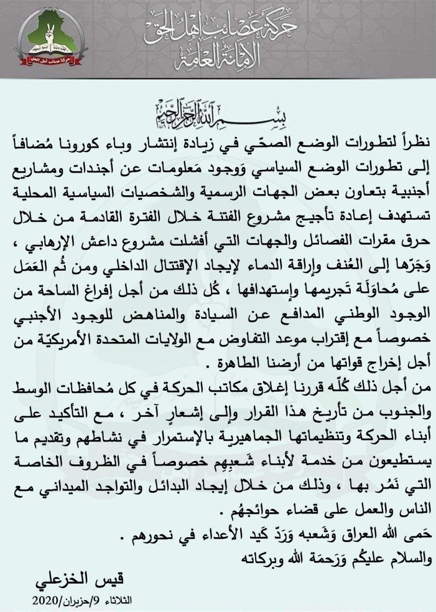 العراق - الكوثر: قرر الأمين العام لعصائب أهل الحق في العراق قيس الخزعلي، امس الثلاثاء، إغلاق مقرات الحركة في مناطق الوسط والجنوب، فيما أكد أن ذلك جاء نظراً لتطورات الوضع الأوضاع الصحية والسياسية ووجود معلومات عن أجندات ومشاريع أجنبية تستهدف إعادة تأجيج مشروع الفتنة.:
