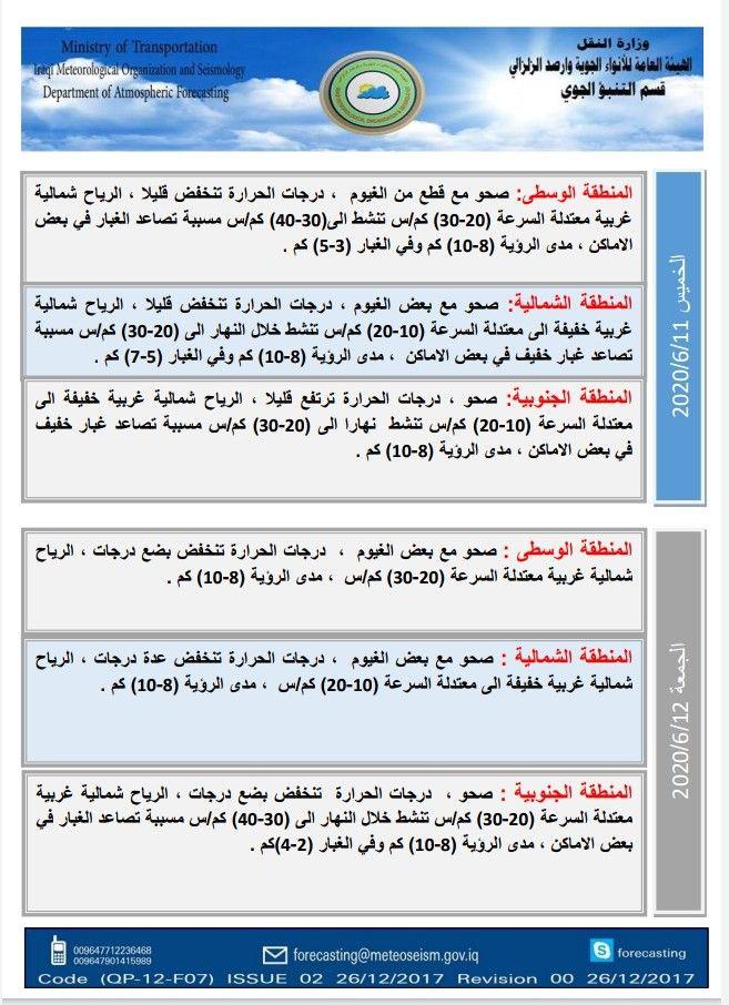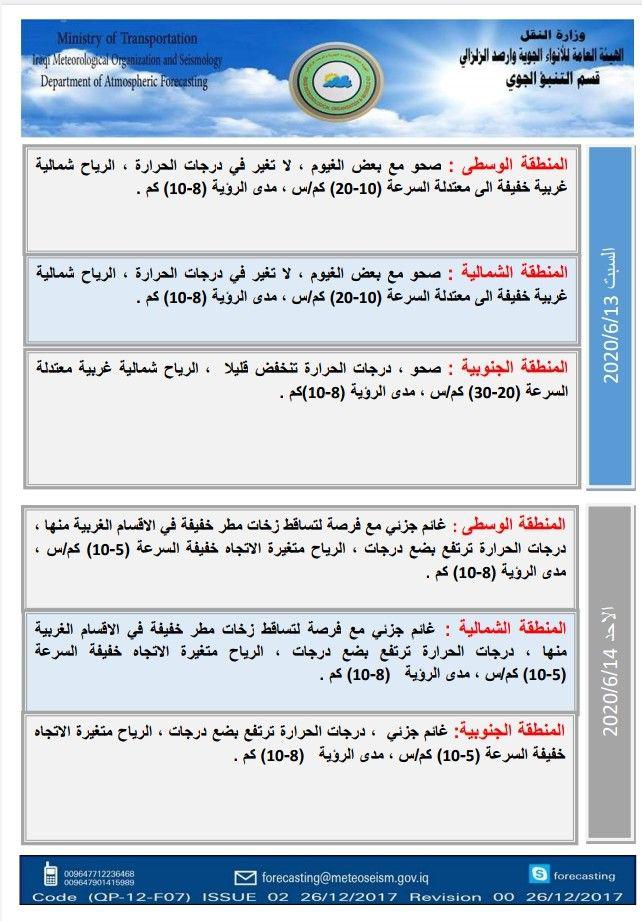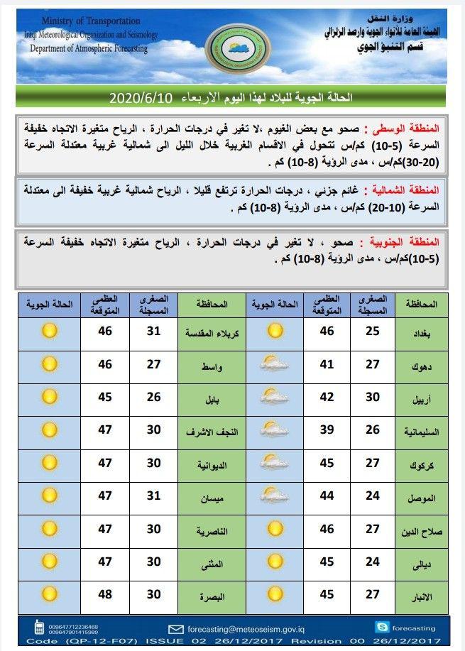 اعلنت هيئة الانواء الجوية العراقية، الاربعاء، عن حالة الطقس للايام المقبلة، فيما اشارت الى ان الاحد المقبل سيشهد تساقط امطار.