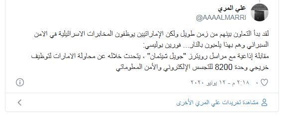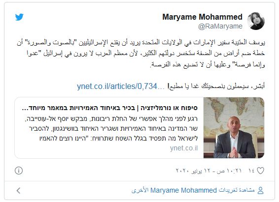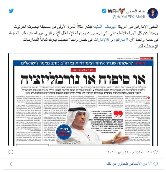 وفي هذا السياق، قالت الإعلامية في قناة الجزيرة القطرية، حياة اليماني، في تغريدة : “السفير الإماراتي في امريكا يوسف العتيبة ينشر مقالاً للمرة الأولى في صحيفة يديعوت أحرونوت وبعيداً عن كل الهراء الاستجدائي لكي ترضى عنهم دولة الاحتلال الإسرائيلي”.