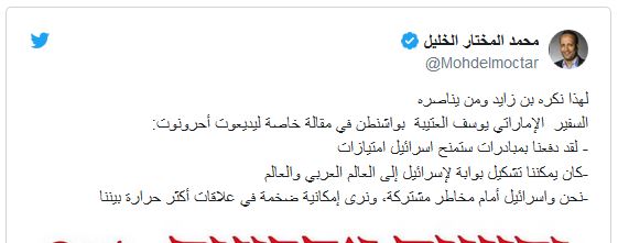 من جهته، قال الإعلامي الموريتاني، محمد مختار الخليل، في تغريدة له: “لهذا نكره بن زايد ومن يناصره، السفير الإماراتي يوسف العتيبة بواشنطن في مقالة خاصة ليديعوت أحرونوت: لقد دفعنا بمبادرات ستمنح اسرائيل امتيازات، كان يمكننا تشكيل بوابة لإسرائيل إلى العالم العربي والعالم، نحن واسرائيل أمام مخاطر مشتركة، ونرى إمكانية ضخمة في علاقات أكثر حرارة بيننا”.
