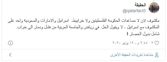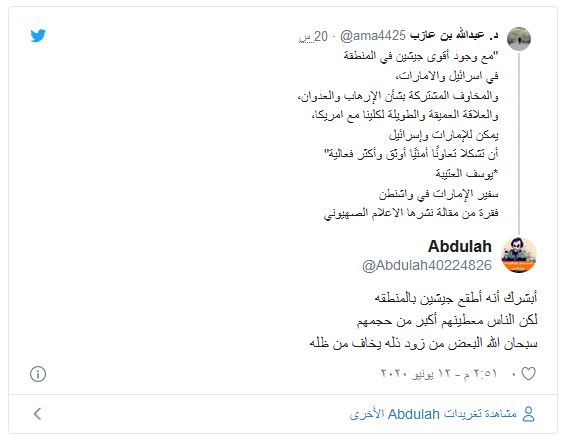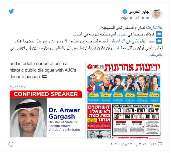 من ناحيته، قال الإعلامي القطري، جابر الحرمي: “الإمارات تسارع الخطى نحو الصهاينة، قرقاش متحدثا في منتدى أهم منظمة يهودية في أميركا، سفير #أبوظبي في #واشنطن العتيبة لصحيفة إسرائيلية: #الامارات وإسرائيل يمكنهما خلق تعاون أمني أوثق وأكثر فعالية .. وأن نكون بوابة لربط إسرائيل بالعالم .. ودبلوماسيين إسرائيليين في #أبوظبي”.