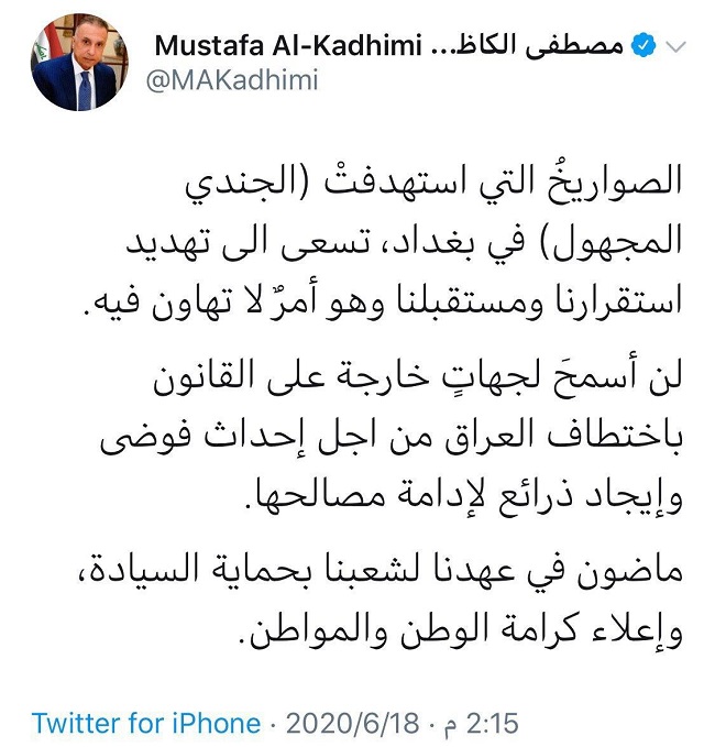 وقال الكاظمي في تغريدة على موقع (تويتر)، إن "الصواريخ التي استهدفت (الجندي المجهول) في بغداد، تسعى الى تهديد استقرارنا ومستقبلنا وهو أمر لا تهاون فيه". وأضاف، "لن أسمح لجهات خارجة على القانون باختطاف العراق من أجل إحداث فوضى وإيجاد ذرائع لإدامة مصالحها، ماضون في عهدنا لشعبنا بحماية السيادة، وإعلاء كرامة الوطن والمواطن".