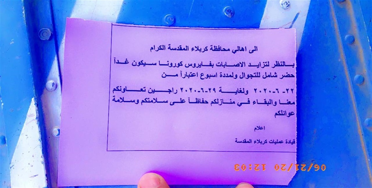 ومن المقرر أن تشهد كربلاء يوم غد الاثنين حظراً شاملاً للتجوال لمدة اسبوع.