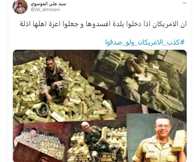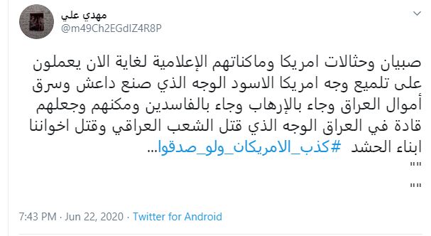 المغرد "مهدي علي" حذر من ان "هناك ماكنات إعلامية لغاية الان يعملون على تلميع وجه امريكا الاسود الوجه الذي صنع داعش وسرق أموال العراق وجاء بالإرهاب وجاء بالفاسدين".