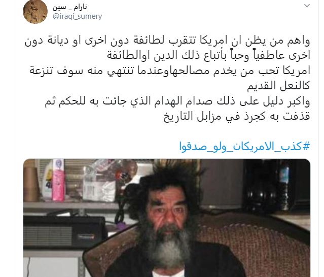 "نارام _ سين" حذر الواهمين من ان "امريكا لا تتقرب لطائفة دون اخرى او ديانة دون اخرى عاطفياً وحباً بأتباع ذلك الدين اوالطائفة امريكا تحب من يخدم مصالحها وعندما تنتهي منه سوف تنزعة كالنعل القديم واكبر دليل على ذلك صدام الهدام الذي جائت به للحكم ثم قذفت به كجرذ في مزابل التاريخ".