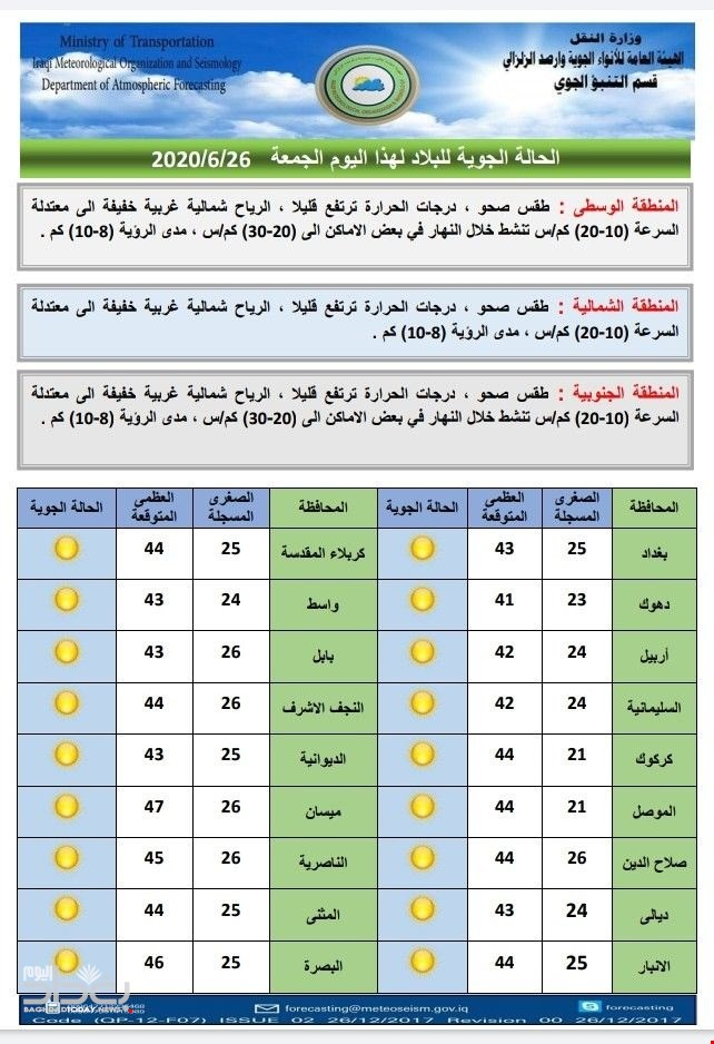 واضاف البيان أن "درجة الحرارة العظمى تبلغ 42 درجة مئوية، في كل من دهوك، واربيل، والسليمانية، و44 في صلاح الدين، و43 في بغداد والموصل 44، وديالى 44 والانبار 44، وبابل43 , 44في كربلاء، والنجف، اما واسط سجلت 43، والديوانية 43، المثنى44، و45 في الناصرية، و46 في البصرة و47 في ميسان".