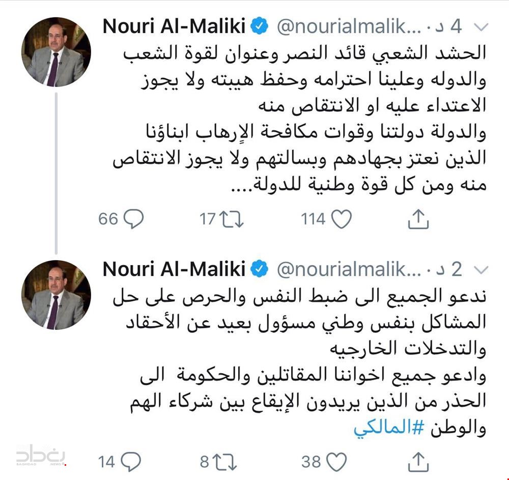 وقال المالكي، عبر تغريدة على منصة تويتر، إن "الحشد الشعبي قائد النصر وعنوان لقوة الشعب والدولة وعلينا احترامه وحفظ هيبته ولا يجوز الاعتداء عليه او الانتقاص منه".