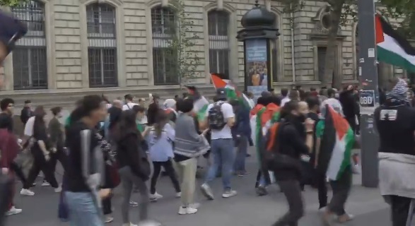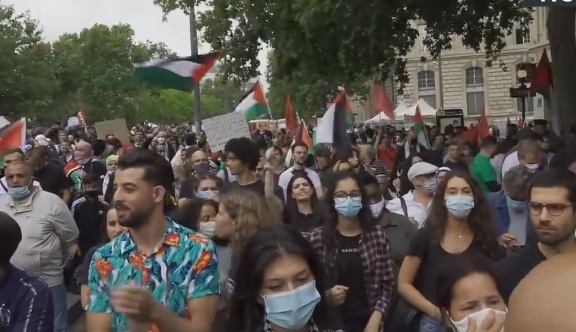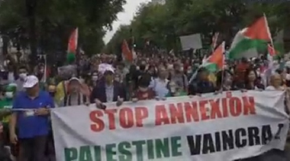 واجتمع المئات وسط باريس، بعد دعوات عدد من المنظمات، وحملوا خلالها الأعلام الفلسطينية، ولافتات رافضة للضم الإسرائيلي.