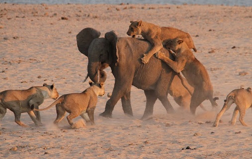 شاهد بالفيديو .. صغير الفيل يهزم 11 أسدا