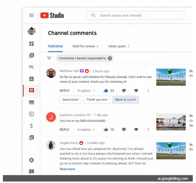 وجاء في تدوينة نشرتها غوغل حول الموضوع "يسعدنا أن نشارك ميزة SmartReply التي طورت لصناع المحتوى ومستخدمي YouTube Studio، هذه الميزة ستمكنهم من التفاعل مع المشاهدين بشكل أفضل، الميزة ستتوفر في البداية للتعليقات التي تكتب باللغتين الإنكليزية والإسبانية، وآلية التعلم الذاتي التي طورناها ستساعد على تطويرها لتشمل عدة لغات في المستقبل.