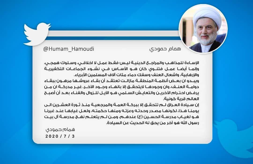 وفي السياق، قال رئيس مجلس الاسلامي الاعلى العراقي الشيخ همام حمودي في تغريدة نشرها مساء الجمعة على حسابه في تويتر ان الاساءة للمذاهب والمراجع الدينية ليس فقط عمل لا اخلاقي، و سلوك همجي وانما ايضا عمل فتنوي كان هو الاساس في نشوء الجماعات التكفيرية والارهابية، واشعال العنف وسفك دماء مئات الاف المسلمين الابرياء.