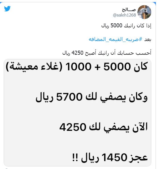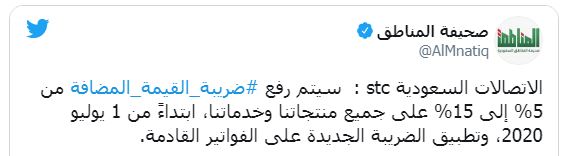 كما أعلنت شركة الاتصالات السعودية على تويتر، عن رفع ضريبة القيمة المضافة من 5% إلى 15% على جميع منتجاتها وخدماتها، ابتداءً من 1 يوليو/تموز 2020، وتطبيق الضريبة الجديدة على الفواتير القادمة.