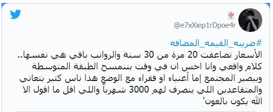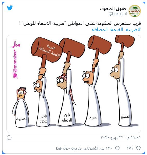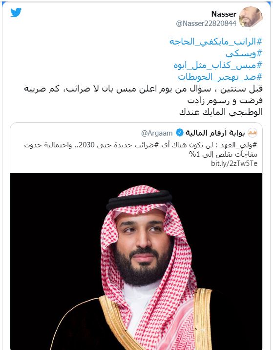 وانتقد نشطاء سياسات ولي العهد السعودي "محمد بن سلمان" عقب قرار رفع ضريبة القيمة المضافة بالمملكة، مؤكدين أن الوضع الاقتصادي في البلاد أصبح سيئا جدا.