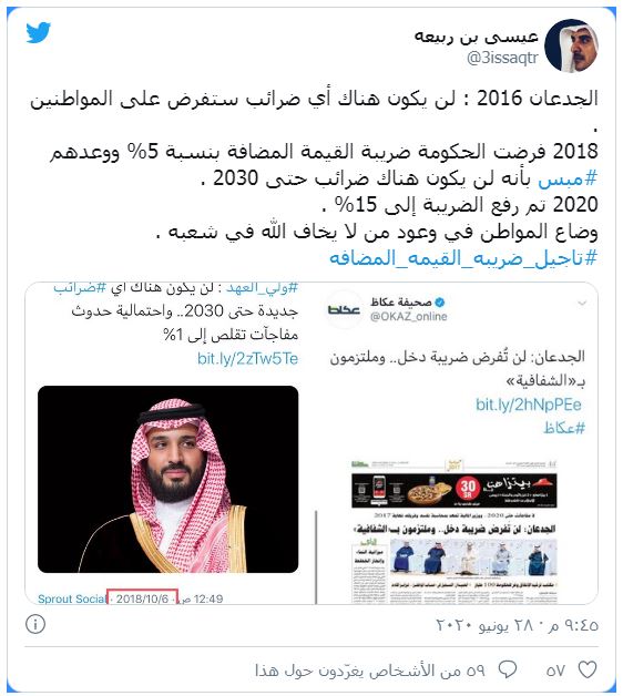 وجاءت الزيادة الضريبية الجديدة مخالفة لتصريحات ولي العهد السعودي محمد بن سلمان عام 2018، والتي أكد فيها -عقب فرض ضريبة القيمة المضافة بنسبة 5%- أن البلاد لن تفرض أي ضرائب جديدة حتى عام 2030.