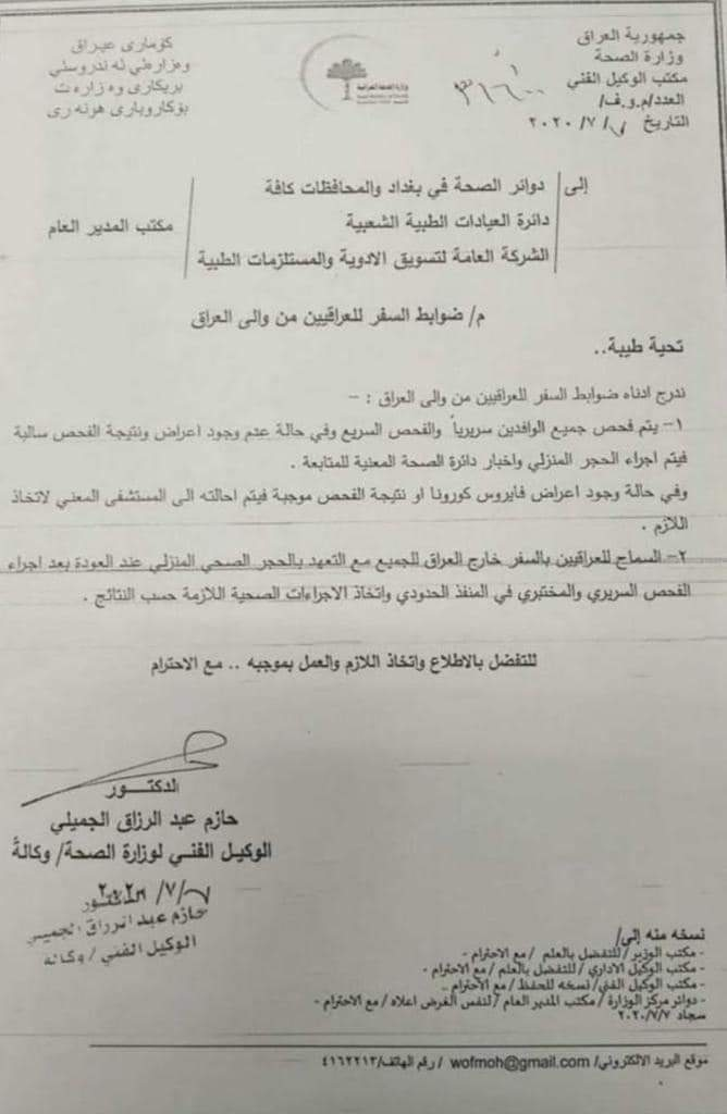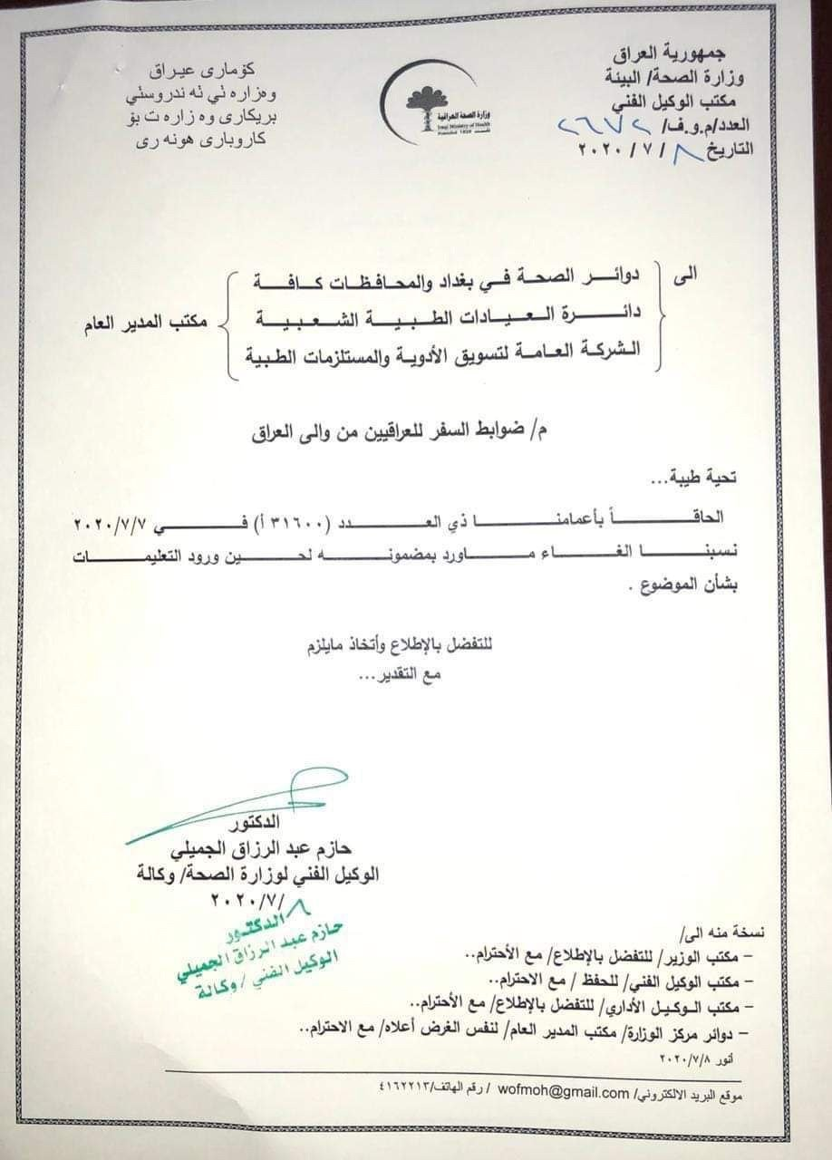 وبحسب الوثيقة ادناه فأن "تم الغاء التعليمات الصادرة اول امس والتي تسمح بالسفر وفق تعليمات وضباط جديدة في ظل تفشي فيروس كورونا".