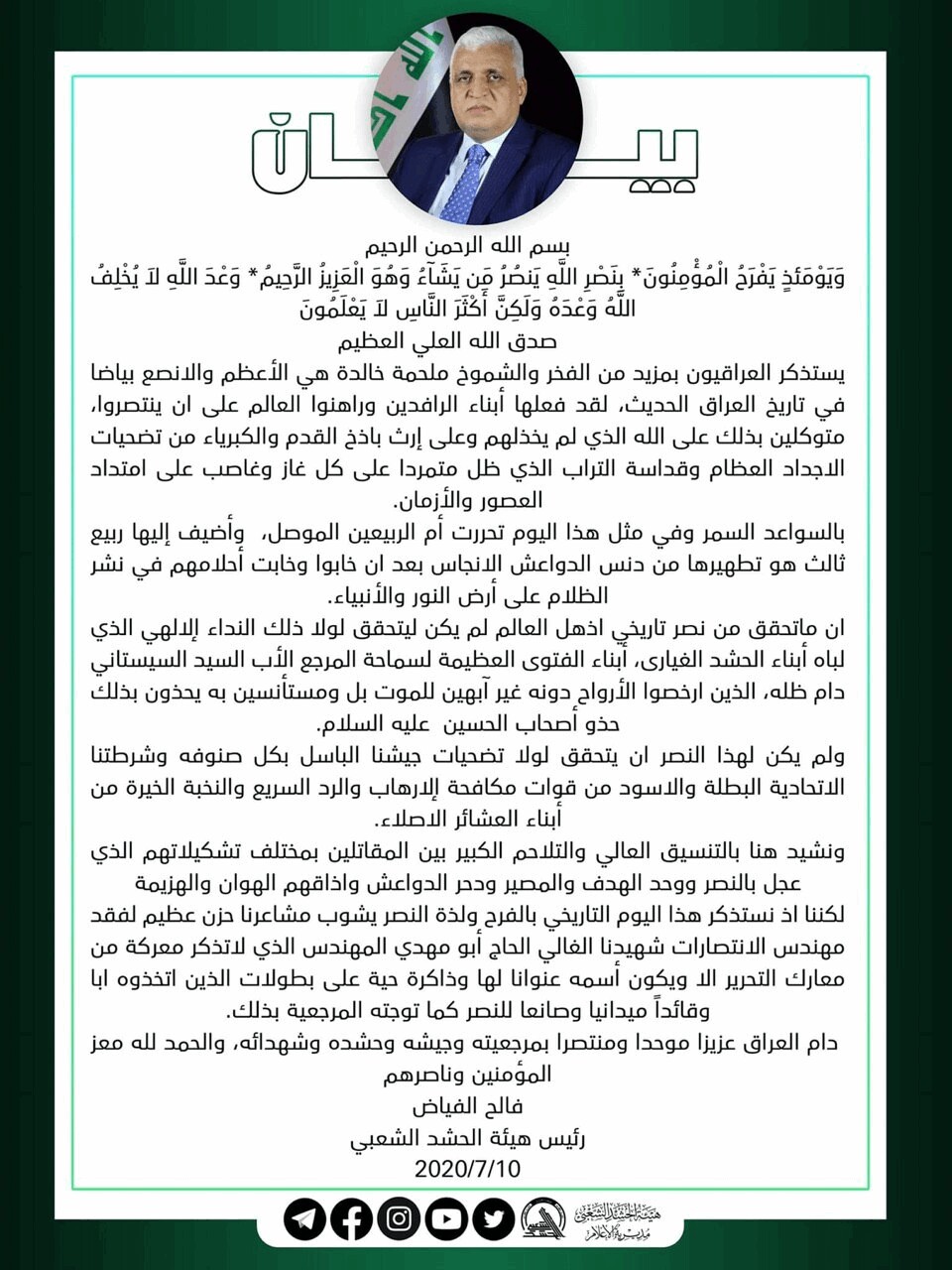 "نصر تأريخي أذهل العالم".. الفياض يصدر بياناً بذكرى تحرير الموصل