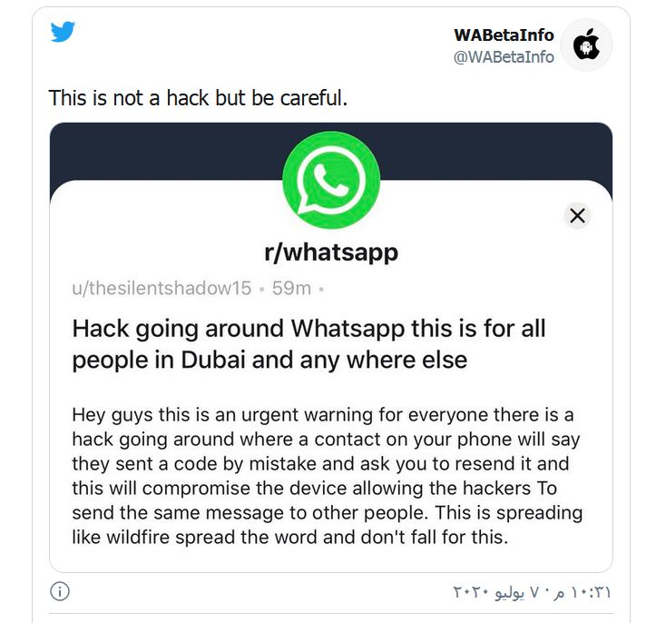وحذر حساب "وابيتا انفو" عبر موقع "تويتر"، المستخدمين من التطبيق المزيف، الذي يشمل نفس خصائص "واتسآب".