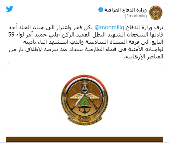 وقالت الوزارة في تغريدة عبر موقعها الرسمي على تويتر إن العميد غيدان قتل "أثناء تأديته لواجباته الأمنية في قضاء الطارمية ببغداد بعد تعرضه لإطلاق نار من العناصر الإرهابية".