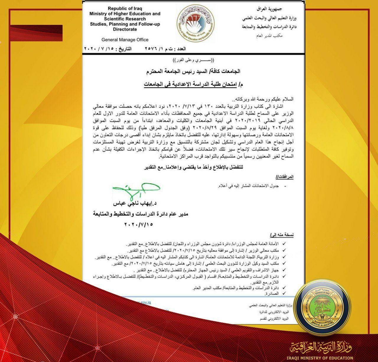 وبين المكتب الاعلامي لوزير التربية  إن "وزير التعليم العالي والبحث العلمي وافق على مقترح التربية واوعز الى كافة الجامعات باداء امتحانات المرحلة الاعدادية في ابنيتها وذلك للحفاظ على قوة الامتحانات العامة ورصانتها وسهولة ادارتها لانجاح سير تلك الامتحانات" .