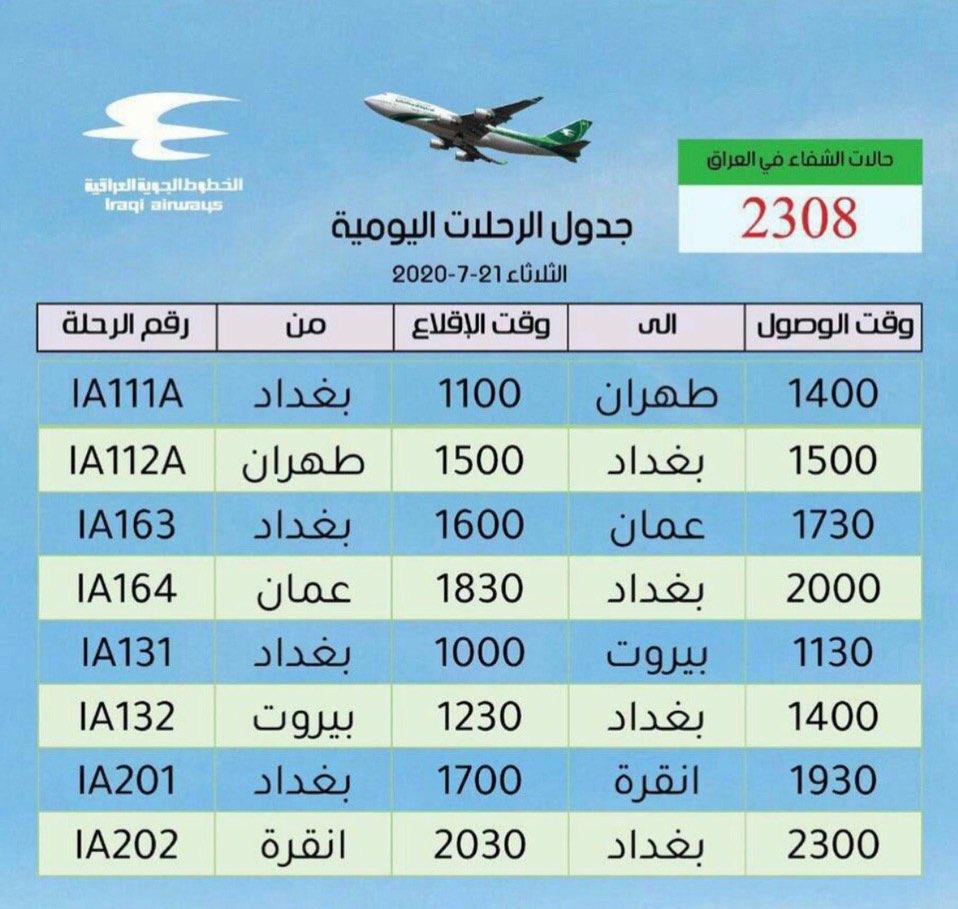 ونشرت الخطوط الجوية العراقية اليوم الثلاثاء جدول رحلاتها لهذا اليوم.