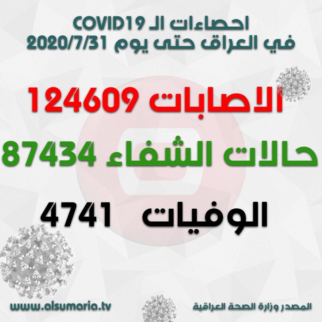 وتابع البيان أن "مجموع الشفاء: 87434 (نسبة الشفاء 70.2 %) ومجموع الاصابات: 124609، الراقدين الكلي: 32434، الراقدين في العناية المركزة: 454، مجموع الوفيات: 4741.