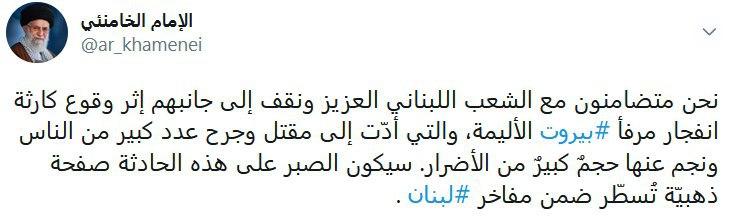 وجاء في تغريدة قائد الثورة: نحن متضامنون مع الشعب اللبناني العزيز ونقف إلى جانبه إثر وقوع كارثة انفجار مرفأ بيروت الأليمة، والتي أدّت إلى مقتل وجرح عدد كبير من الناس ونجم عنها حجمٌ كبيرٌ من الأضرار. سيكون الصبر على هذه الحادثة صفحة ذهبيّة تُسطّر ضمن مفاخر لبنان .