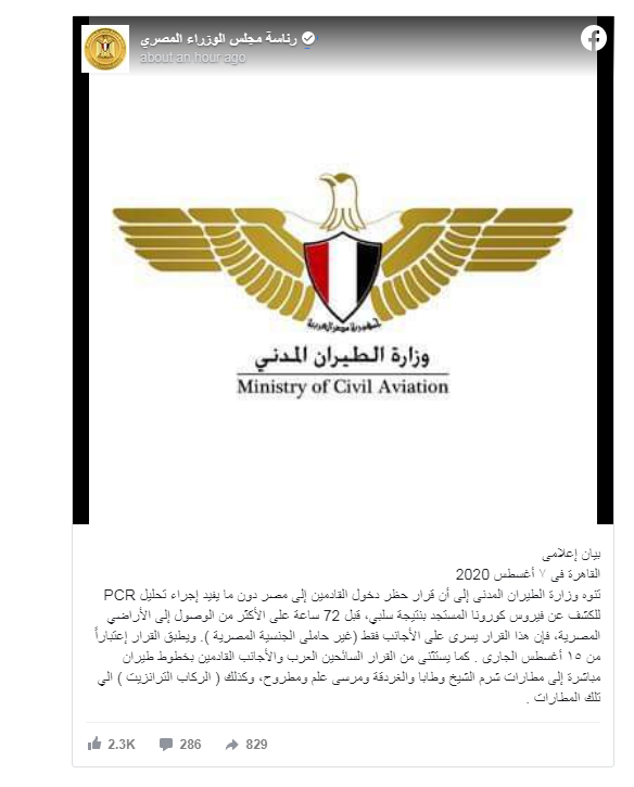 وقالت وزارة الطيران المدنى إن قرار حظر دخول القادمين إلى مصر دون ما يفيد إجراء تحليل PCR للكشف عن فيروس كورونا المستجد بنتيجة سلبي، قبل 72 ساعة على الأكثر من الوصول إلى الأراضي المصرية، فإن هذا القرار يسري على الأجانب فقط (غير حاملي الجنسية المصرية).