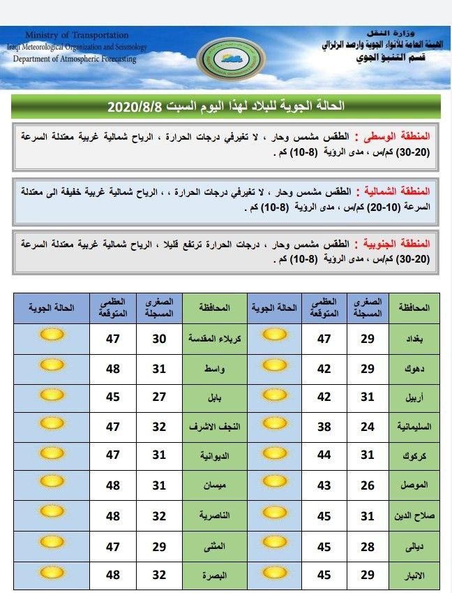 ادناه الحالة الجوية لهذا اليوم والايام الاربعة المقبلة في عموم العراق.