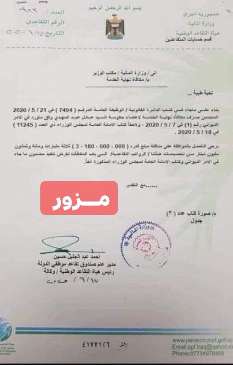 تداولت مواقع التواصل الاجتماعي الكتاب ادناه ونود إن نوضح للمتقاعدين الكرام إن هذا الكتاب مزور وغير صادر من هيأة التقاعد الوطنية العراقية، وإن ما ينشر في هذه المواقع الغرض منه أرباك عمل الهيأة وتأجيج الشارع ضد عمل المؤسسات الحكومية.