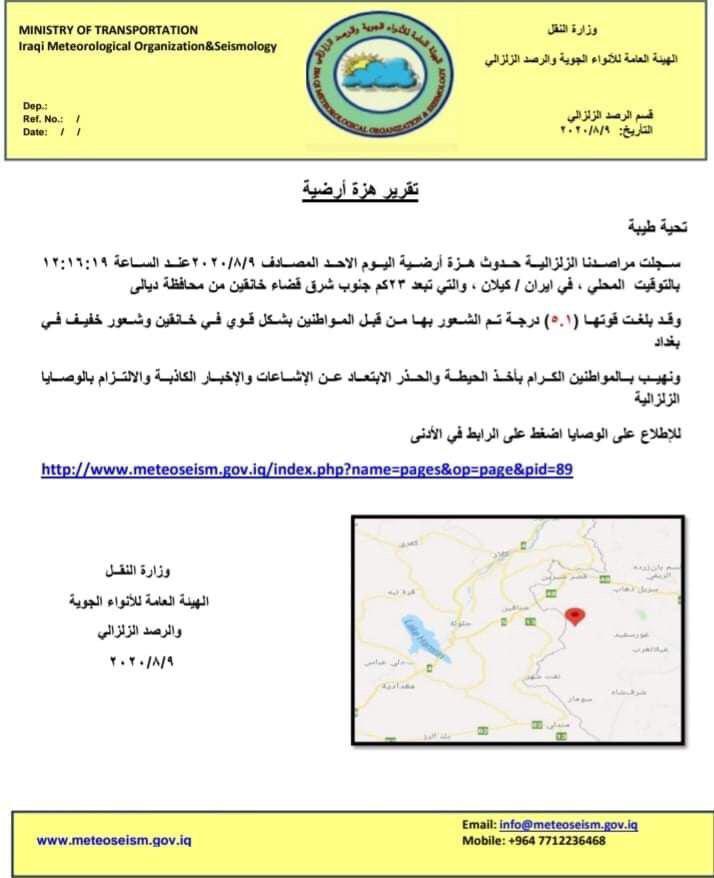 واضافت ان "قوتها بلغت (5،1) درجة على مقياس رختر وتبعد(23) كم جنوب شرق مدينة قضاء خانقين محافظة ديالى"، مشيرة الى انه "تم الشعور قوي بها من قبل المواطنين في خانقين كما شعر فيها المواطنين في بغداد بشكل خفيف".