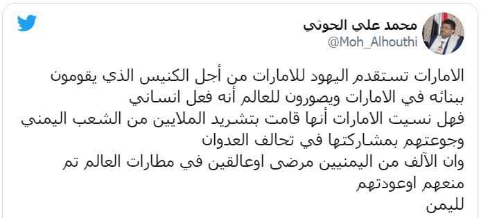 وقال "الحوثي" على حسابه بموقع "تويتر": "الإمارات تستقدم اليهود للإمارات من أجل الكنيس الذي يقومون ببنائه في الإمارات ويصورون للعالم أنه فعل إنساني".